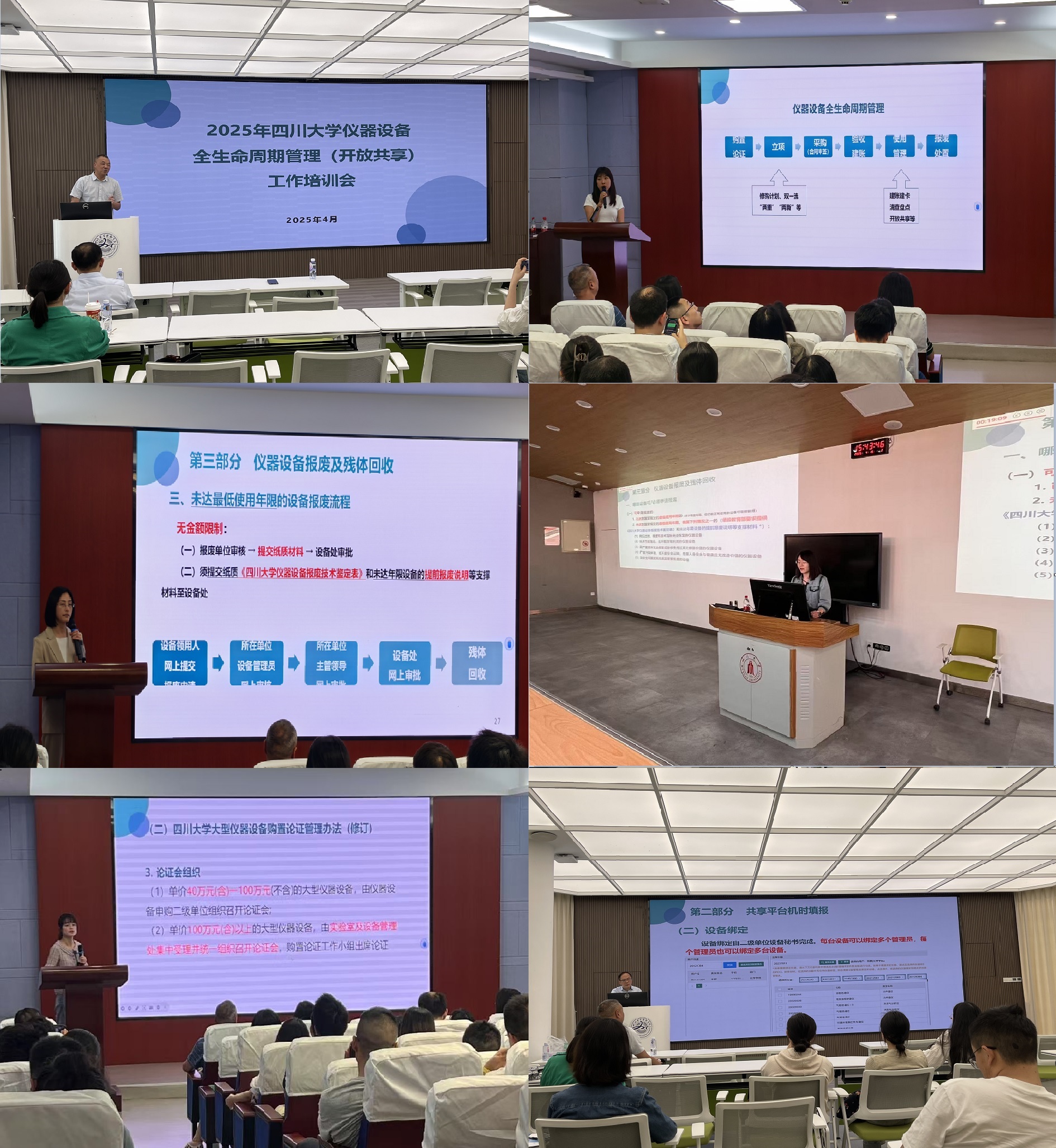 培训会上,设备处相关老师分别对仪器设备全生命周期各管理环节(设备建账、维修、损坏与遗失赔偿、报废及残体回收、采购合同审签等)内容进行了详细讲解;对学校最新修订的设备管理、大型仪器设备开放共享管理文件制度要点和设备开放共享平台机时填报、机时记录问题进行了分析解读。